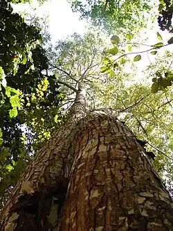 The most common families in the terra firme forests are Lecythidaceae, Chrysobalanaceae, Burseraceae, Fabaceae, Lauraceae and Sapotaceae. Tree species include Lecythis odora, Lecythis turbinata, Cenostigma tocantina, Bombax tocantinum, and Bauhinia bombaciflora, a large liana. The legume Vouacapoua americana is the most important timber tree, growing only in the east of the Amazon region. Brazil nut (Bertholletia excelsa) is uncommon in the region and there are few orchids. The threatened mahogany (Swietenia macrophylla) may be found along the upper Capim and Guamá rivers. Other rare or threatened trees include Pilocarpus microphyllus and Dicypellium caryophyllatum.[1]