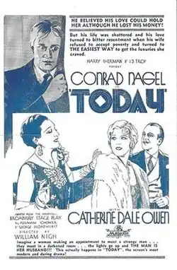 Today is a 1930 American pre-Code drama film directed by William Nigh and starring Conrad Nagel, Catherine Dale Owen, and Sarah Padden.[1] It was co-written by Seton I. Miller and was based on a 1913 play by George Howells Broadhurst, which had previously been made into a silent film of the same title. The film's sets were designed by the art director Albert S. D'Agostino.