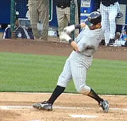 Helton's power and RBI production stayed relatively level to his previous year's stats during the 2007 season, as he managed 17 home runs and 91 RBI. Despite these numbers being below his career averages, Helton kept up his string of seven consecutive seasons with an on-base percentage higher than .400, nine consecutive seasons with a batting average above .300, and had also been walked more times than he had struck out (a feat he had accomplished in seven of his first ten full seasons).[18] Helton recorded his 1,000th career hit at Coors Field on June 20, 2007, in a 6–1 home win over the New York Yankees, becoming only the fifth active player to have 1,000 career hits in one ballpark.[27] On September 9, in 4–2 home victory over the San Diego Padres, Helton hit his 35th double of the season. This made him the only player in MLB history to have hit 35 or more doubles in at least 10 consecutive seasons (1998–2007).[28][29] Helton hit his 300th career home run on September 16, in a 13–0 home win over the Florida Marlins.[30][31] He became the first player to hit 300 home runs for the Rockies.[32]