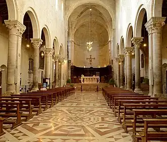 The cathedral is built on a Latin cross plan. The nave is subdivided into three aisles, of which the central one is the widest and tallest, separated by two arcades of round arches supported by Corinthian columns. The main nave and side aisles are roofed with wooden beams, whereas the transept has groin vaulting.