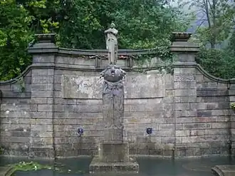The memorial comprises an ornamental fountain with basin in which stands a carved relief pillar depicting draped female figures with wreath and palm. The pillar is surmounted by a St George standing on an orb. The orb features four dragon head water spouts. The fountain is placed in front of a long wall with tablets bearing the names of the fallen. The fountain and wall are set within a formal garden in which also stood two freestanding statues of "The Lamp of Memory" and "The Shield of Honour".[1] The original statues were stolen in 1996, however, in summer 2011 Todmorden Civic Society under the direction of Paul Clarke, a former Gunner, embarked on a campaign to raise funds and have the statues replaced in time for centenary of the commencement of the First World War.[6] After over three years of fundraising and successfully applying for grants towards the project, the two replica statues, carved by Nick Roberson, member of The Master Carvers Association were unveiled at a Rededication Service held at the Garden of Remembrance after a Military Parade by the Todmorden branch of the British Legion on Sunday 12 October.