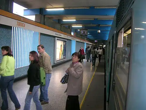 Toesca is a metro station on the Line 2 of the Santiago Metro, in Santiago, Chile. It is located in the middle of a sunken stretch of the Autopista Central. The station is named for the nearby Toesca Street, which in turn is named after Joaquín Toesca, who designed La Moneda Palace.