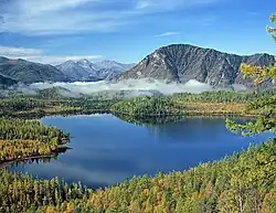 Tofalariya has a land area of 27,000 square meters. The geography of the region is made up of two main features: approximately 90% of the territory belongs to the taiga and the other 10% is classified as alpine tundra. The territory has several large lakes.[13] Agul'skoye Ozero is the third largest lake in the region, with a length of more than 10 kilometers. The 1.5 kilometer long Kusurgasheva glacier is also found in the region.[14] The region has reserves of gold, lead, uranium, tantalum, and polymetals.[13] Several industrial mining companies operate in the region.[15]