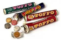Toffo was a British brand of toffee, produced by Mackintosh's. They came individually wrapped, in a roll, and were available in plain, mint, and assorted (apple, chocolate, strawberry, pineapple, banana, and mint) flavours.[1] It was one of its main brands along with Polo, Quality Street, Toffee Crisp, Fox's Glacier Mints, and Caramac.[2] Its original advertising slogan was "a man's gotta chew what a man's gotta chew".[3][4] Production was taken over by Rowntree Mackintosh Confectionery after Rowntree's merged with Mackintosh's in 1969.[5]