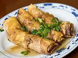 The fried version is known as (腐皮卷, fu pei gyun). The first character "fu" comes from tofu, though a more accurate description is that the skin is made from the ingredient bean curd. Some Cantonese restaurants serve the fried crispy version at night, often with mayonnaise as dipping sauce. Another name is the (豆腐卷, tofu gyun).[1] Some ingredients include shrimp, chicken, leeks, bamboo shoots, small carrots, tofu, scallions, sesame oil, or bean sprouts.[1][2]
