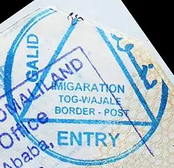 Tog Wajaale (also known as Wajaale, Wajale, Tug Wajale, Togwajaale) is a city on the border of Somaliland and Ethiopia.[2] Tog Wajaale is the main border crossing for goods coming in and out of Somaliland, primarily from the port city of Berbera, Somaliland's main port.[3]