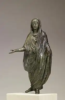 Citizens attending Rome's frequent religious festivals and associated games were expected to wear the toga.[83] The toga praetexta was the normal garb for most Roman priesthoods, which tended to be the preserve of high status citizens. When offering sacrifice, libation and prayer, and when performing augury, the officiant priest covered his head with a fold of his toga, drawn up from the back: the ritual was thus performed capite velato (with covered head). This was believed a distinctively Roman form,[90] in contrast to Etruscan, Greek and other foreign practices. The Etruscans seem to have sacrificed bareheaded (capite aperto).[91] In Rome, the so-called ritus graecus ("Greek rite") was used for deities believed Greek in origin or character; the officiant, even if a Roman citizen, wore Greek-style robes with wreathed or bare head, not the toga.[92] It has been argued that the Roman expression of piety capite velato influenced Paul's prohibition against Christian men praying with covered heads: "Any man who prays or prophesies with his head covered dishonors his head."[93]