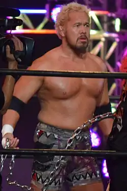Shinya Makabe (真壁 伸也, Makabe Shin'ya; born September 29, 1972),[1] better known by his ring name Togi Makabe (真壁 刀義, Makabe Tōgi) is a Japanese professional wrestler, trained by and performing for New Japan Pro-Wrestling (NJPW), where he is a former one-time IWGP Heavyweight Champion, two-time IWGP Tag Team Champion, two-time NEVER Openweight Champion and one-time NEVER Openweight 6-Man Tag Team Champion.