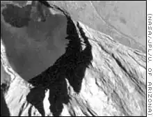 The area between the mountain and the nearby volcanoes, Radegast Patera and Tohil Patera contain a number of dark and white silicate flows, which are thought to be lava ponds or small lava lakes.
