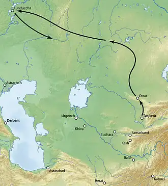 In 1395, Timur launched his final assault on the Golden Horde.[1][3] He decisively routed Tokhtamysh in the Battle of the Terek River on 15 April 1395. All the major cities of the khanate were destroyed:[1] Sarai, Ukek, Majar, Azaq, Tana and Astrakhan. Timur's attack on the cities of the Golden Horde in 1395 produced his first Western European victims, since it caused the destruction of the Italian trading colonies (comptoirs) in Sarai, Tana and Astrakhan.[1] During the siege of Tana,[4] the trading communities sent representatives to treat with Timur, but the latter only used them in a ruse to reconnoiter the city.[1] The Genoese city of Caffa on the Crimean peninsula was spared, despite being a former ally of Tokhtamysh.[1]