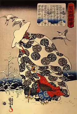 Lady Tokiwa is primarily associated, in literature and art, with an incident in which she fled through the snow, protecting her young son with her robes, during the Heiji Rebellion in 1160.