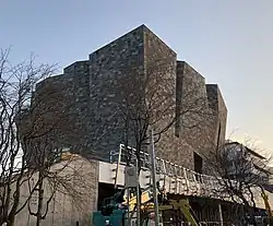 The museum structure is a monolith, the facade of which is clad in 20,000 plus granite pieces fitted to the multiple shifts within its obtuse shape. Kuma has said of the building's design that "It represents the Earth's energy that breaks through the ground".[6][7]