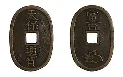In 1835 the Tokugawa government started minting copper 100 mon named Tenpō Tsūhō (Kyūjitai: 天保通寶 ; Shinjitai: 天保通宝) as a way to solve its budgetary deficit, as the coin contained only 5½ as much copper as a 1 mon Kan'ei tsūhō this eventually lead to inflation.[9][10] This was later followed by the Satsuma Domain issuing a 100 mon coin of their own in 1862 to supposedly produce currency for the Ryukyu Kingdom, while in reality doing it to boost their own economy. These Ryūkyū Tsūhō (琉球通寳) coins eventually started circulating in other provinces as well.[11][12][13]