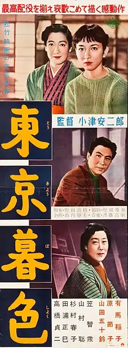 Tokyo Twilight (東京暮色, Tōkyō boshoku) is a 1957 Japanese drama film by Yasujirō Ozu. It is the story of two sisters (played by Ineko Arima and Ozu regular Setsuko Hara) who are reunited with a mother who left them as children. The film is considered amongst Ozu's darkest postwar films; it is well received though lesser known. It is his last film shot in black and white.