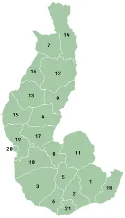Toliara Province was divided into four regions of Madagascar - Androy, Anosy, Atsimo Andrefana and Menabe. These four regions became the first-level administrative divisions when the provinces were abolished in 2009. They are sub-divided into 21 districts: