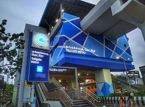 Tollgate is an elevated metro station on the North-South Corridor of the Line 1 Extension of the Blue Line of Chennai Metro in Chennai, India. This station will serve the neighbourhoods of Tollgate and other northern suburbs of Chennai.