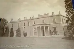 In 1761, Tolmers Park was in the hands of Sir Frances Vincent, who replaced the Tudor house with the present building in the classical style with an Ionian porch. The Northaw Inclosure Act 1803 (43 Geo. 3. c. 11 Pr.) allowed part of Northaw Common to be enclosed and planted with specimen trees to form Home Wood. The whole estate was sold at auction in 1834. It was bought by Samuel Mills, of Russell Square, a textile and property magnate, who already owned adjoining land in Cuffley. The estate then passed to his son, Thomas Mills, who was MP for Totnes and then to his other son, John Remington Mills, also an MP (for Wycombe).[1] In 1860, Tolmers was leased to Thomas Bazley, a Manchester cotton mill owner who had been a Royal Commissioner for the Great Exhibition and was MP for Manchester. He became 1st Baronet Bazley of Tolmers in 1869 (motto: Finem Respice).[2] The ownership of the estate eventually passed to Samuel Mills’ two great-granddaughters, one of whom was the novelist Mary Cholmondeley. From 1910 to 1918 the eastern edge of the estate was busy with excavations for the Hertford Loop railway line, one of the last great projects of the railway age.