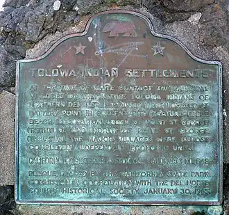 Tolowa Indian Village Site is a historical site in Crescent City, California in Del Norte County. The Native America Tolowa Tribe had villages in what is now northern Del Norte County. The villages were on Battery Point, Pebble Beach, south of Point St. George, and north of Point St. George. There were a number of large independent Tolowa villages in the area. The site is a California Historical Landmark No. 649. A marker was placed on the site in 1965 by the California State Park Commission working with the Del Norte County Historical Society.[1][2]