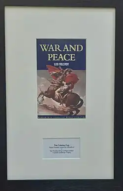 The Tolstoy Cup is a football match played between the students of the Department of Peace Studies at the University of Bradford and the Department of War Studies at King's College London. The first match was played in 1992 and succeeding games came at intermittent intervals until 2007, when the event became an annual one.[1] Following a six year hiatus, largely due to the covid-19 virus, the fixture was replayed on 9 June 2024 as part of the Peace Studies Golden Jubilee Conference at the University of Bradford.
