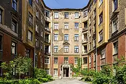 Decorating facades of the backyard in the same manner as the front ones was uncommon for Petersburg. Three interconnected yards that create an inner street are colloquially called the Street of Lidval.[8] Prominent Russian art historian Boris Kirikov finds the Renaissance arches the most decorative part of the design. Made of limestone blocks, they are framed with pilasters and obelisks. Because of the irregular shape of the land, the inner street is angular and the yards open one after another, creating an unusual perspective effect. Lidval repeated this design in construction of the Nobel House on Lesnoy avenue, 20. According to his idea, the inner yards were to create the spirit of good-neighbourliness with a semi-private zone where the dwellers and the passers-by wouldn't be isolated from each other.[9][6][10]