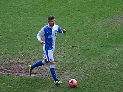 He made his debut in a 1–1 draw against Derby County, as a 77th-minute substitute for Alex Marrow.[37] Two days later, Cairney made his full debut for the club in an eventful League Cup clash with Carlisle United, scoring one and providing one assist, before being sent off for the first time in his career after two bookable offences.[38] Cairney equalised for Blackburn in a 5–2 victory over Barnsley on 24 August, opening his Championship account for the club.[39] Since joining Blackburn Rovers, Cairney established himself in the first team there, having quickly made an impact.[40][41] He then set up two goals on 1 January 2014, in a 2–1 win over Leeds United.[42]