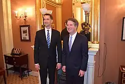 On August 6, 2013, Cotton announced he would challenge Democratic incumbent Mark Pryor for his seat in the United States Senate.[48] Stuart Rothenberg of Roll Call called Pryor the most vulnerable senator seeking reelection in 2014.[49] Cotton was endorsed by the conservative Club for Growth PAC,[50][51][52] Senator Marco Rubio,[53] the National Federation of Independent Business,[54] and former presidential candidate Mitt Romney, who campaigned for Cotton.[55][56] The Associated Press called the race for Cotton immediately after the polls closed;[57] he received 56.5% of the vote to Pryor's 39.4%.[58] Cotton was sworn into office on January 6, 2015.[59]