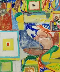 Goldenberg began his career in the 1970s as a figurative sculptor of detailed, epoxy-resin works.[1] He turning to abstract painting—between roughly 1974–1983[26]—influenced by artists such as Clyfford Still and Richard Diebenkorn, which largely consisted of painterly fields and architecturally ordered, rectangular areas of color.[8][27][28][1] In 1980, Art in America noted this work for its lush surfaces, delicate coloration, and emotion checked by a "cool intelligence" reminiscent of Jasper Johns.[5] After first-hand encounters in Europe in the early 1980s with masters such as Titian and Breughel, Goldenberg deemed abstraction a limitation.[1] He responded with the expressive "Vines" series (1983–6), followed by several still life series depicting glasses, bowls and table tops (1986–7; 1997–8)[26] and the "Grids" series (1990–6), which combined largely square grid patterns with floating, stylized representational imagery (foliage, bottles, glasses) and abstract passages of color (e.g., Yellow Racer, 1990).[29]