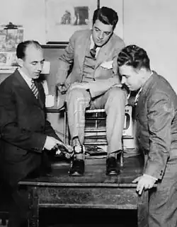 ![]() Howard (center) wearing the camera he used to take the photo of Ruth Snyder's execution c. 1928[1] | |