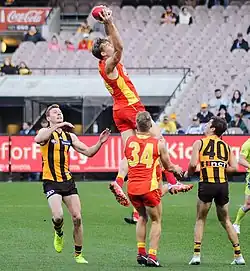 Meanwhile, media speculation continued over Lynch's contractual future, with reports claiming Hawthorn, Richmond and Collingwood remained front runners to sign him.[101] In mid-July Suns coach Stuart Dew said he believed Lynch was unlikely to stay and less than a week later Collingwood coach Nathan Buckley admitted he had met with Lynch and his management about a potential Collingwood offer.[102][103] In early August Lynch informed Suns players, coaches and front office staff of his intention to leave the Gold Coast and sign a free agent contract with a Melbourne-based club at the end of the season.[104] He was reportedly met with strong criticism by teammates upon the announcement and was subsequently stripped of his captaincy by the club and stood down from all duties other than those that concerned his continuing knee injury rehabilitation.[105][106] An AFL Media report that same week claimed officials at multiple clubs believed Lynch was near-certain to join Richmond despite no official decision having yet being made.[107] The Age's Caroline Wilson reported in late August that Lynch would join Richmond and in September another report by The Age said he had informed Collingwood and Hawthorn that he would not sign with them despite refusing to confirm his decision publicly before the end of that year's finals series.[108][109][110] Within a week of the season's end, Lynch confirmed he would sign with Richmond, accepting what was reported to be a seven-year deal worth $6.5 million, heavily backloaded and beginning with around $500,000 in its first year.[111][112]