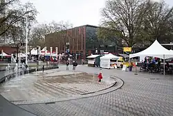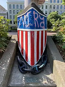 In 1978, the Francis Murnane Wharf, the only public memorial to a labor leader in the state of Oregon,[7] was dedicated in the park by Harry Bridges, president of the International Longshore and Warehouse Union. The memorial consisted of a bronze plaque and steps leading down to a floating dock on the Willamette River. Murnane was a leader of Portland ILWU Local 8 and a gadfly for historic preservation. In 2009, the plaque and steps were removed by the expansion of the Saturday Market.[8]