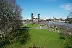 Governor Tom McCall Waterfront Park is a 36.59-acre (148,100 m2) park located in downtown Portland, Oregon, along the Willamette River. After the 1974 removal of Harbor Drive, a major milestone in the freeway removal movement, the park was opened to the public in 1978. The park covers 13 tax lots and is owned by the City of Portland (Portland Parks and Recreation).[1] The park was renamed in 1984 to honor Tom McCall, the Oregon governor who pledged his support for the beautification of the west bank of the Willamette River—harkening back to the City Beautiful plans at the turn of the century which envisioned parks and greenways along the river.[2] The park is bordered by RiverPlace to the south, the Steel Bridge to the north, Naito Parkway to the west, and Willamette River to the east. In October 2012, Waterfront Park was voted one of America's ten greatest public spaces by the American Planning Association.[3]