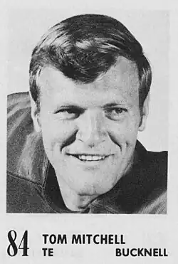 A 6'2", 215 lb (98 kg). tight end from Bucknell University and member of the Bucknell Athletics Hall of Fame, Mitchell played one season (1966) for the American Football League (AFL)'s Oakland Raiders, and ten seasons (1968–1977) in the National Football League (NFL) for the Baltimore Colts and the San Francisco 49ers. He was nicknamed "the Crocodile" and his pouring of a pitcher of beer on the head of author George Plimpton is recounted in the book Mad Ducks and Bears. He died of cancer at the age of 72 in 2017.[2] He was father-in-law to former Tampa Bay Buccaneers and current Rutgers head coach Greg Schiano, and grandfather to Bucknell defensive lineman Joe Schiano.