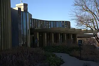 Originally the Kiwanis Community Centre at 111 Lakeside Drive, the land was declared as surplus by Stratford city council in 2018.[5] In addition to using the space since 1971, the choice of this location for theatrical performances is considered a rock in a metaphorical stream, which is reflected in the architecture of the structure.[6] Originally there was a curling rink on this site; however, the community felt it did not serve the needs of the community.