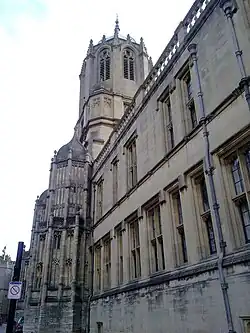 Tom Tower is a bell tower in Oxford, England, named after its bell, Great Tom. It stands over Tom Gate, on St Aldates, the main entrance of Christ Church, Oxford, which leads into Tom Quad. This square tower with an octagonal lantern and facetted ogee dome was designed by Christopher Wren and built 1681–82. The strength of Oxford architectural tradition and Christ Church's connection to its founder, Henry VIII, motivated the decision to complete the gatehouse structure, left unfinished by Cardinal Wolsey at the date of his fall from power in 1529, and which had remained roofless since. Wren made a case for working in a Late Gothic style—that it "ought to be Gothick to agree with the Founders worke"[1]—a style that had not been seen in a prominent building for a hundred and fifty years, making Tom Tower a lonely precursor[2] of the Gothic Revival that got underway in the mid-18th century.[3] Wren never came to supervise the structure as it was being erected by the stonemason he had recommended, Christopher Kempster of Burford.[4]