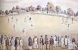 The Australian colonies were described as "cricket mad" in the 1850s, and Victorians, in particular, were said to live "in an atmosphere of cricket".[62] Intercolonial contests, first held in 1851, provided an outlet for the at times intense rivalry between Victoria and New South Wales. With his reputation preceding him, Wills bore Victoria's hopes of winning its first match against the elder colony.[63] William Hammersley, a former acquaintance in England and now captain of the Victoria XI, recalled Wills's first appearance on the Melbourne Cricket Ground (MCG) for a trial match, staged one week after his return:[34]