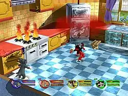 Tom and Jerry in War of the Whiskers is a 3D fighting video game developed by VIS Entertainment, published by NewKidCo for PlayStation 2, GameCube, and Xbox. It is the sequel to the 3D cartoon fighting video game Tom and Jerry in Fists of Furry for Nintendo 64 and Microsoft Windows. Where characters from Tom and Jerry franchise fights against each other in a destructible environments arenas. It allows up to (two on PlayStaion 2 Version, and) four players to play simultaneously.