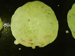 A tomato omelette (Marathi: टॉमॅटो धिरडे) is a breakfast dish prepared mostly in Maharashtra, India. It is referred to as an omelette because of its visual appearance, but this is a misnomer, as it actually contains no egg product or by-product and is vegan . The main ingredient is chickpea flour or besan.[1] Sometimes, it is also made with dosa batter (rice flour and urad dal paste), with a small quantity of besan only to provide binding, in which case it is classified as Uttapam.