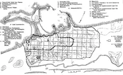 The Egyptian Supreme Council for Antiquities has officially recognized over 140 search attempts for Alexander's tomb.[3] Mahmoud el-Falaki (1815–1885), who compiled the map of ancient Alexandria, believed Alexander's tomb is in the center of Alexandria, at the intersection of the Via Canopica (modern Horreya Avenue) and the ancient street labeled R5.[18] Since then several other scholars such as Tasos Neroutsos, Heinrich Kiepert and Ernst von Sieglin placed the tomb in the same area.[18] In 1850, Ambroise Schilizzi announced the discovery of alleged Alexander's mummy and tomb inside the Nabi Daniel Mosque in Alexandria.[19] Later, in 1879, a stone worker accidentally broke through the vaulted chamber inside the basement of that mosque. Some granite monuments with an angular summit were discerned there, but the entrance was then walled up and the stone worker was asked not to disclose the incident. The image on a Roman lamp in the National Museum of Poznań and others at the British Museum and the Hermitage Museum are interpreted by some scholars as showing Alexandria with the Soma Mausoleum pictured as a building with a pyramidal roof.[8] In 1888, Heinrich Schliemann attempted to locate Alexander's tomb within the Nabi Daniel Mosque, but he was denied permission to excavate.[19]