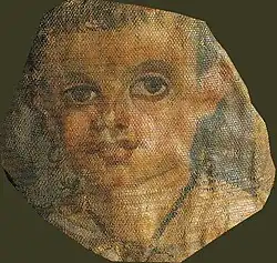 For a long time, scholarship believed the portrait of the younger child to depict a boy. Recent research proves that the child is a girl. Around her neck is a leather band with a lunula pendant, an apotropaic amulet commonly worn by women or girls. Her chiton is violet in colour, a feature exclusive to females. The depiction of it exposing her left shoulder, an attribute of the goddess Aphrodite, aimed to underline erotic attraction. It is commonly used on the mummy portraits of women and even young girls.[9] CT scanning of this child, referred to in the study as a boy, estimated an age at death of between two and three years old. This child showed evidence of septic arthritis of the right hip joint.[10]