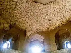 A large central double-layered brick bulbous dome rests atop the octagonal base.[1] The bulbous dome that crowns the tomb was once covered in a marble veneer,[8] and is of a shape that is unique among all Mughal structures.[2] Such bulbous domes were an innovation of Shah Jahan's era, and were used to great effect at other sites such as the Taj Mahal in Agra.[9]