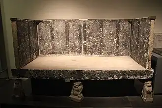 The stone couch is composed of stone slabs, decorated with reliefs showing the life of the deceased and scene of the afterlife.[1] Contrary to the other known Sogdian funerary monuments, the decorations of the tomb do not have Zoroastrian elements, and they follow Chinese stylistics traditions, with the use of shallow engraved lines.[1]