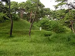 The mausoleum is a 11.5 m (38 ft)-high tumulus bordered at the base with stone blocks. Each side of the tumulus is 34 m (112 ft) long.[19] The tomb has a 22 m2 (240 sq ft) pyramidal inner chamber, a front chamber and a gallery made with stones. The chamber faces southwest.[20] The renovated tomb of the king is the most prominent tomb and is one among the 20 tombs in Chinpa Village. The current tomb complex is quite modern.