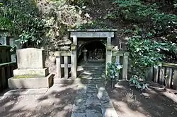 The tomb of Minamoto no Yoritomo (源頼朝の墓) (see photo below) is a monument in Kamakura, Kanagawa, Japan, located some hundred meters north of the site where the palace called Ōkura Bakufu, seat of Minamoto no Yoritomo's government, once stood. Although there is no evidence his remains are actually there, it is commonly assumed to be the resting place of Minamoto no Yoritomo, founder and first shōgun of the Kamakura shogunate. The cenotaph consists of a 186 cm gorintō (a Buddhist stone stupa) surrounded by a stone tamagaki (a fence usually delimiting the sacred soil of a Shinto shrine), and was built during the Edo period (1603–1868),[1] far after the shōgun's death in 1199. In the course of history, the site's prestige has attracted other structures, so that now it is occupied by the Site of the Hokke-dō, (the spot where Yoritomo's Hokke-dō, or funeral temple, used to stand during the Edo period), Shirahata Shrine (白幡神社, Shirahata Jinja) (not to be confused with the homonymous shrine part of Tsurugaoka Hachiman-gū), and the black stone stele commemorating the Hokke-dō and the mass suicide of the Miura clan. A couple of hundred meters further to the east lie the yagura (an artificial cave used during the Kamakura period as a grave or as a cenotaph) of the Miura clan, the twin tombs of Oe no Hiromoto and of his son Mōri Suemitsu, and the grave of Yoritomo's illegitimate son Shimazu Tadahisa. The grave of Yoritomo and the ruins of the Hokke-dō are national Historic Sites.[2]