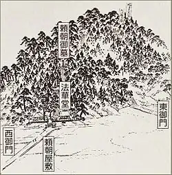 When Yoritomo suddenly died falling from his horse on February 8, 1199 (Shōji era, 13th day of the first month) he was buried in a Buddhist temple on the side of a hill just north of his government's seat, the Ōkura Bakufu.[2] The temple stood where the tomb of Yoritomo now is, and was moved elsewhere in the Edo period. The temple hadn't yet assumed the name it is now known under, but was simply Yoritomo's jibutsudō (持仏堂), the temple which enshrined his tutelary goddess Shō-Kannon. The name under which this area in now known, Nishi Mikado or "Western Gate", is itself a relic of the time in which it was just west of the shōgun's palace.