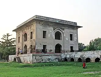 Unlike other Mughal tombs, which are built in gardens, this tomb does not have a dome and was built in a sunken water tank.[3][4] The tomb stands at the center of the tank on a raised platform .[2] The tank was "200 by 200 Mughal gaz in size".[5] Later, however the tank was converted into a Mughal garden.[4] The corners of the tank were denoted by pavilions and the tomb could be accessed through "lofty gateways" on the north and south through a masonry bridge.[2]