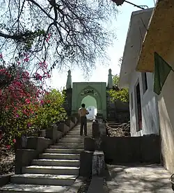 The tomb is a modest domed structure, located on the crest of the old ramparts. It was entirely rebuilt in the second half of the 20th century after the site was vandalised. The remains of a small mosque, also rebuilt but retaining older fragments, is found on the staircase up to the tomb. The inscription, damaged but now kept behind protective iron doors, dates to the 15th century in the time of the Sultans of Malwa. It records that the building was a reconstruction, made after an earlier tomb had fallen into ruin.[1]