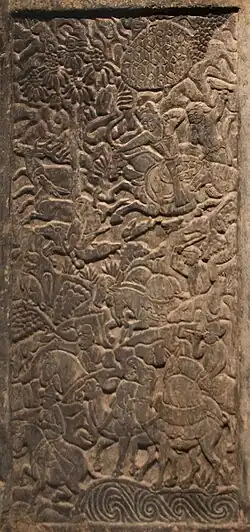 Wirkak's sarcophagus is densely decorated with bas-reliefs to convey blind architectural details and a complex figural programme.[12] The four sides are carved with four-armed guardian deities, along with other Zoroastrian divinities and scenes of sacrifice, rising to heaven, banqueting, hunting and procession. Their subjects and style demonstrate features of the Western Regions (Central Asia). The French historian Étienne de La Vaissière argues that the iconography of these bas-reliefs representing a religious syncretism by blending Manichaean and Zoroastrian symbols in the funerary art.[13] Despite the fact that the sarcophagus has adopted a unique style to creating a miniature model of a traditional Chinese temple, the sinicisation of Wirkak's tomb is of the lowest degree among the other two Sogdian tombs: those of Kang Ye and An Jia.[14]