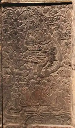 - Panel No. 8 Sage in a Cave and Angelic Rescue: the motif of a sage in a cave occupies the upper third of the carving, the scene is set in a forested mountainous landscape framed by flowering trees. The body of the sage is seated casually with legs crossed and gesturing with right hand to a small four-legged animal that looks like a monkey. Below shows some winged apsaras or angelic beings flying above the water, with a man and a woman (possibly symbolising Wirkak and Wiyusi).