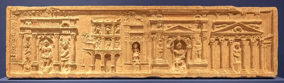 One of the reliefs associated with the tomb consists of an elongated rectangular space showing a series of five buildings, identified by inscriptions, generally believed to represent public monuments on which the founding Quintus Haterius had worked.[20] The monuments are, from left to right: