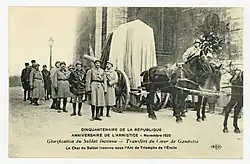 On 10 November 1920, after Private (Soldat de Deuxième Classe) Auguste Thin had made his choice, the coffin of the Unknown Soldier left Verdun immediately, under military escort.[14] The body was transported by train to Paris at the Panthéon, where the President of the Republic, Alexandre Millerand, delivered an address.[15] Safeguarded all night at Place Denfert-Rochereau, the coffin made a solemn entrance under the Arc de Triomphe on Armistice Day, 11 November 1920. It was placed on the gun carriage of a cannon 155, but was not buried until 28 January 1921, in the presence of civil and military authorities, including the marshals who distinguished themselves during the First World War (Ferdinand Foch, Joseph Joffre and Philippe Pétain). Also present were: Belgian Foreign Minister Henri Jaspar, British Prime Minister David Lloyd George, and a representative of Portugal. At 8:30 am, the troops presented their arms. The Minister of War, Louis Barthou, bowed before the coffin and delivered a statement: Au nom de la France pieusement reconnaissante et unanime, je salue le Soldat inconnu qui est mort pour elle ("In the name of France piously grateful and unanimous, I salute the Unknown Soldier who died for her").[16]